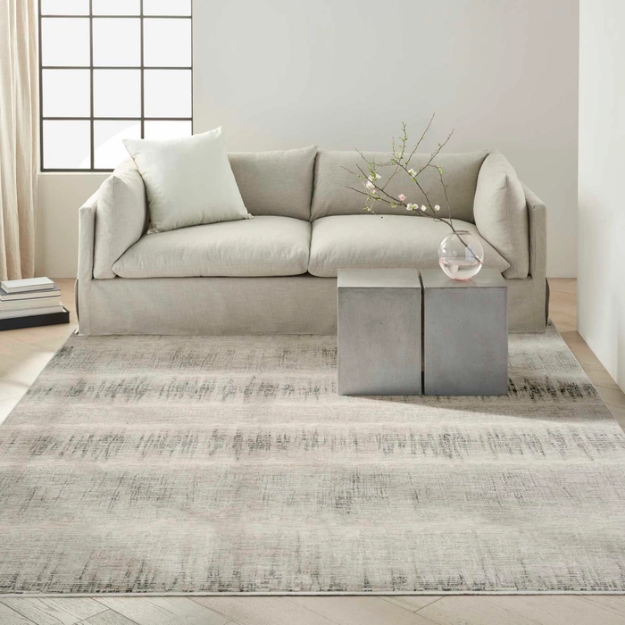 Invite cool, refined energy to your dcor with this charcoal grey abstract rug from the Calvin Klein Notes collection. The irregular stripe design is overlaid with a subtly distressed finish that adds depth and visual appeal to modern spaces. Made from 100% polyester for easy care.